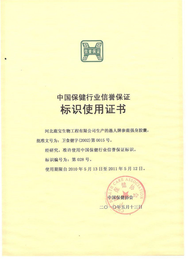 中國保健行業(yè)信譽保證標識使用證書